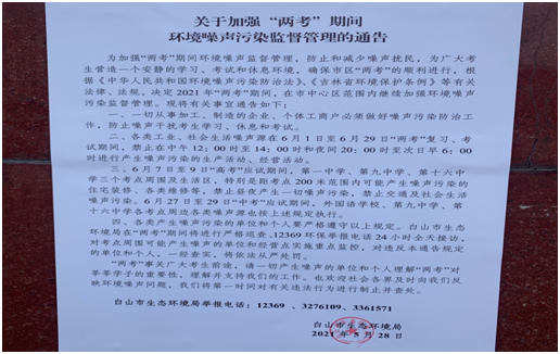 为切实做好两考期间“绿色护考”工作,使广大考生有一个安静的学习、休息和考试环境,浑江区分局联合白山市环境监察支队成立“两考”环境护考应急工作小组,开展“绿色护考行动”,切实加强环境噪声污染监督管理,确保“两考”期间良好环境。