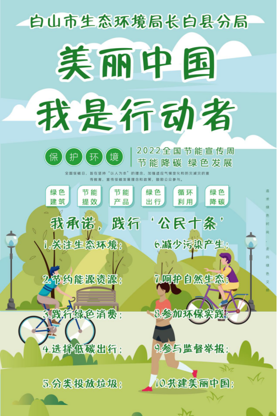 “我承诺,践行‘公民十条’”,由长白县分局宣教中心工作人员精心制作的“美丽中国,我是行动者!”海报,用简单的文字和一目了然的图片展示“公民十条”的内容,宣传《公民生态环境行为规范(试行)》。依托新媒体平台,长白县分局在线上倡导公众从“关注生态环境、节约能源资源、践行绿色消费、选择低碳出行、分类投放垃圾、减少污染产生、呵护自然生态、参加环保实践、参与监督举报、共建美丽中国”十个方面做起,增强节能低碳意识,履行生态环境责任,争做生态环境保护的宣传者、践行者,形成简约适度、绿色低碳的生活方式,携手共建天蓝、地绿、水清的美丽家园。