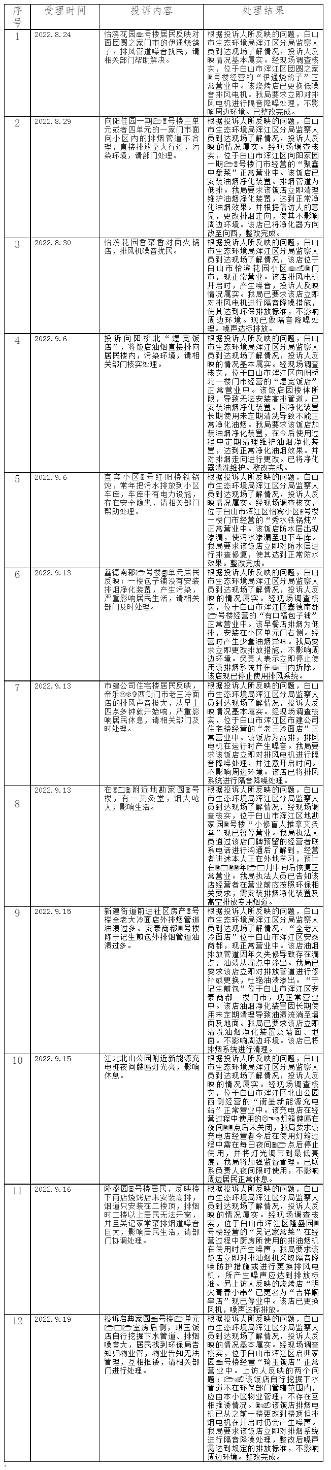 浑江区信访案件信息公开登记表(2022年9月)