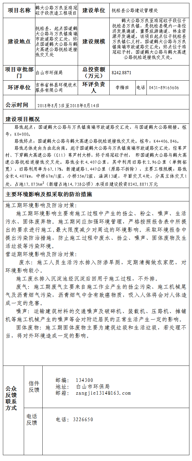鹤大公路万良至鸡冠砬子段改造工程项目环境影响评价审批公示表