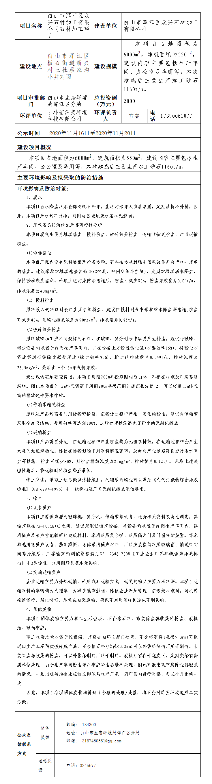 白山市浑江区众兴石材加工有限公司石材加工项目环境影响评价审批公示表