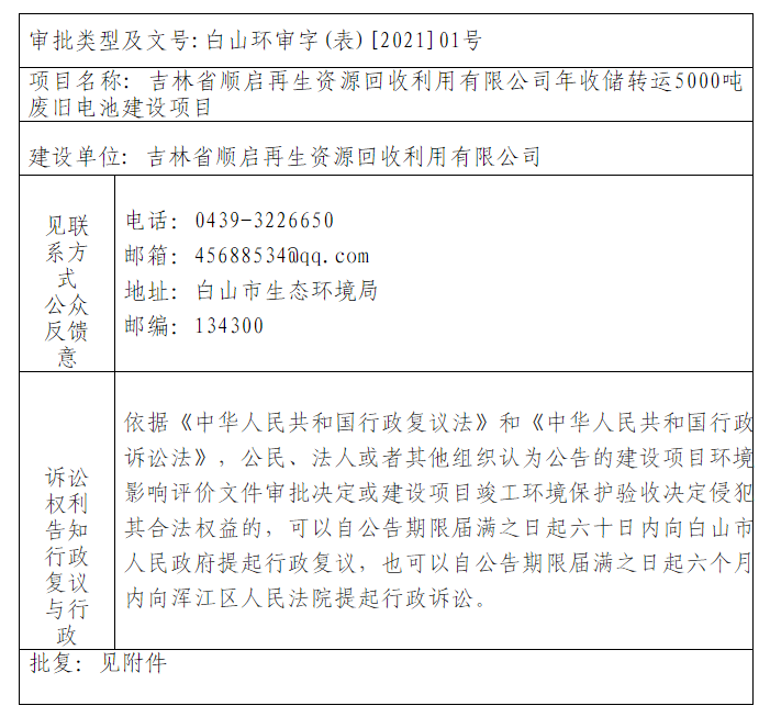 吉林省顺启再生资源回收利用有限公司年收储转运5000吨废旧电池建设项目环境影响报告表审批决定公开
