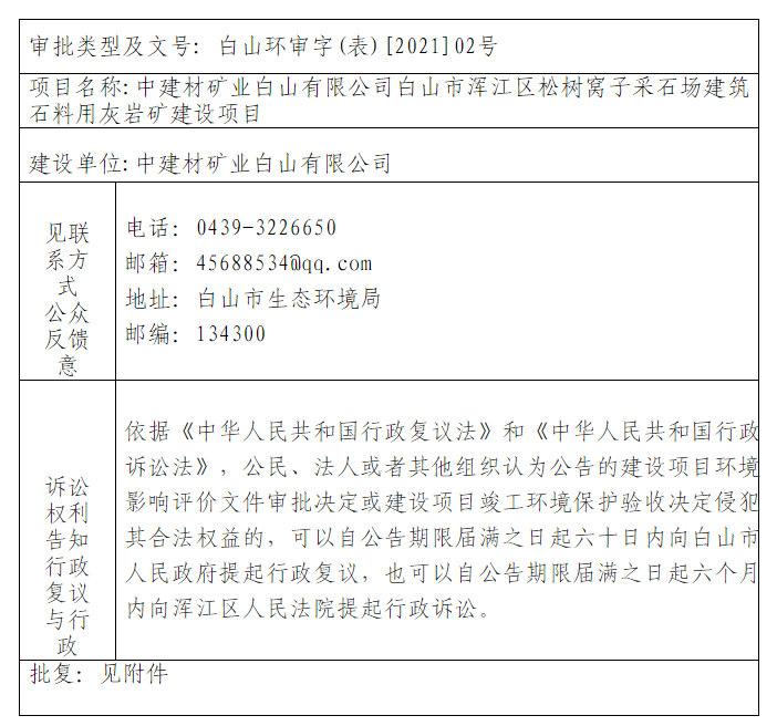 中建材矿业白山有限公司白山市浑江区松树窝子采石场建筑石料用灰岩矿建设项目环境影响报告表审批决定公开