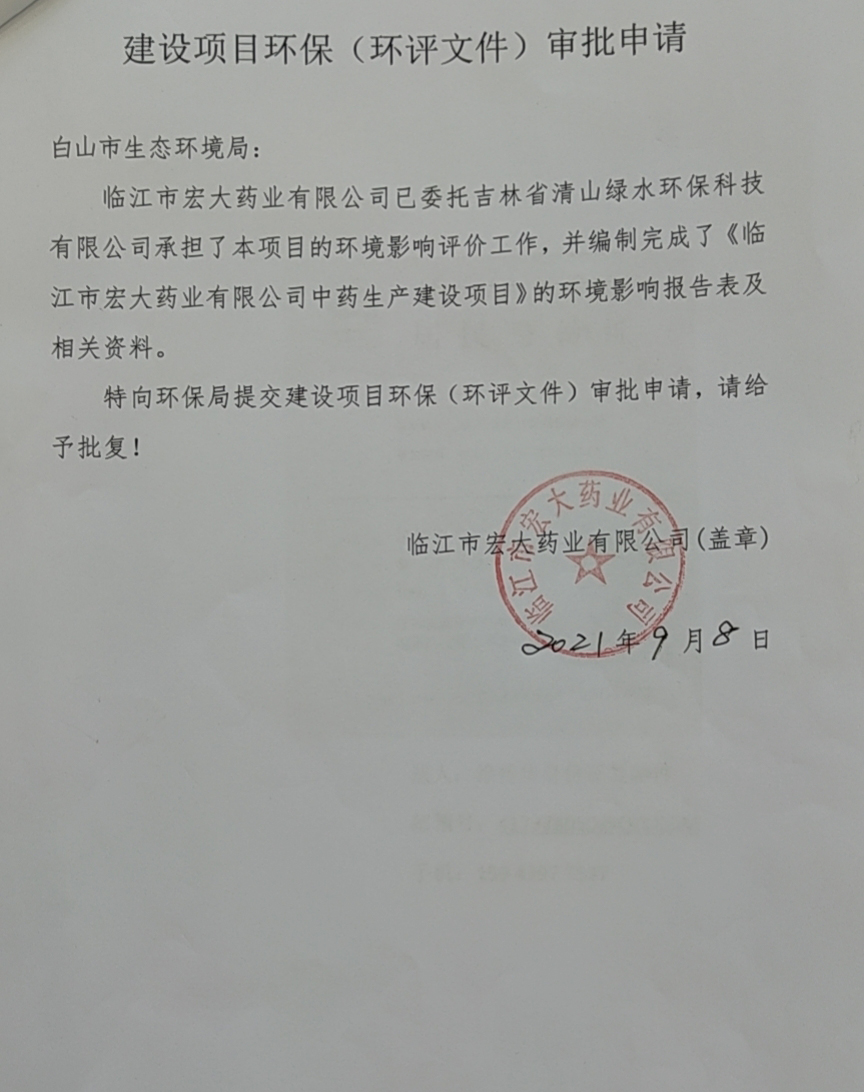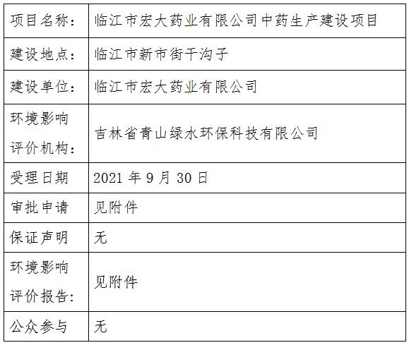 根据建设项目环境影响评价审批程序的有关规定,现将临江市宏大药业有限公司中药生产建设项目环境影响报告表受理情况予以公示,公示期为7个工作日。自公示之日起,建设单位和利害关系人享有要求听证的权利。