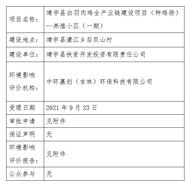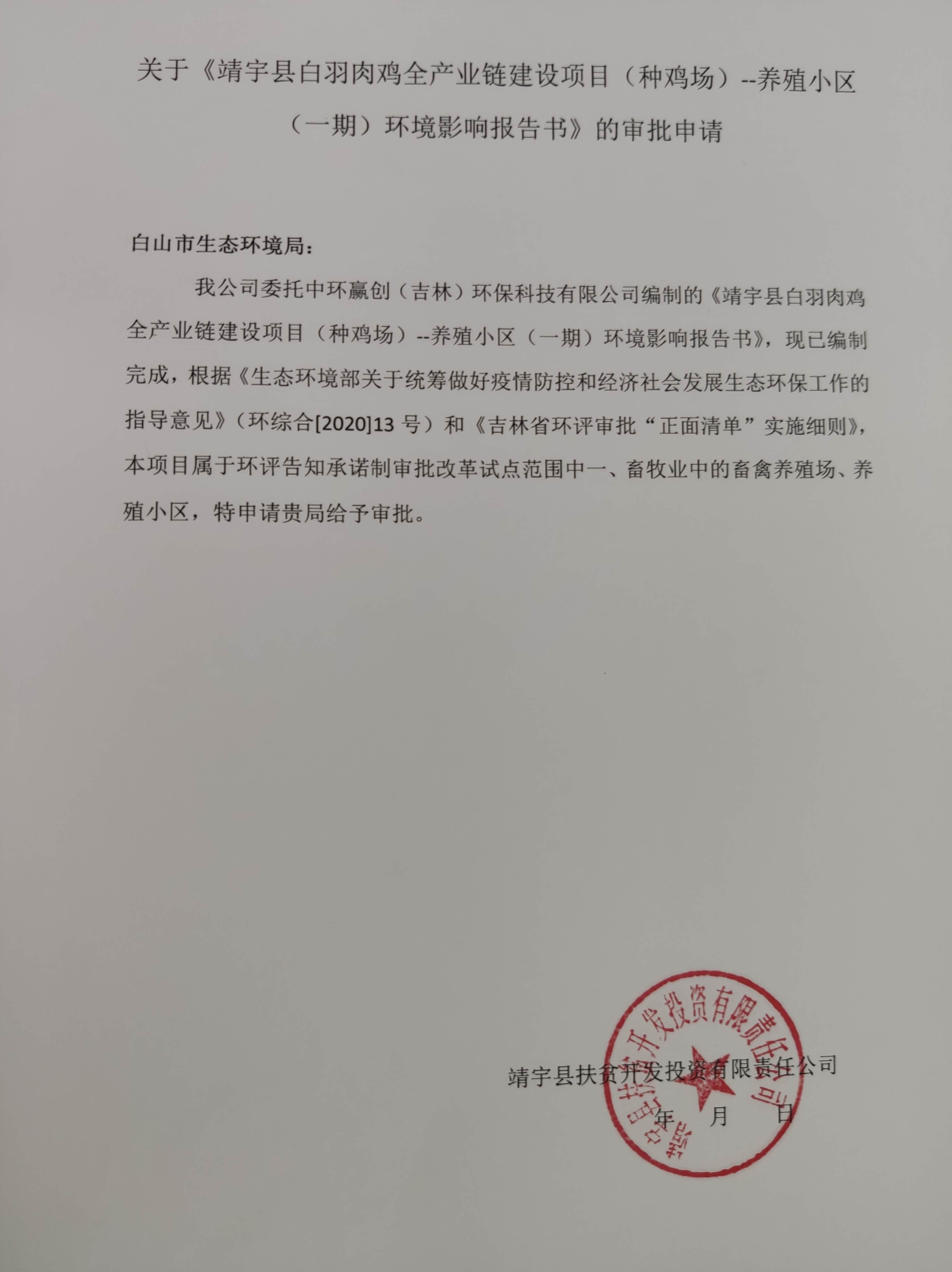根据建设项目环境影响评价审批程序的有关规定,现将靖宇县白羽肉鸡全产业链建设项目(种鸡场)—养殖小区(一期)建设项目环境影响报告书受理情况予以公示,公示期为5个工作日。自公示之日起,建设单位和利害关系人享有要求听证的权利。