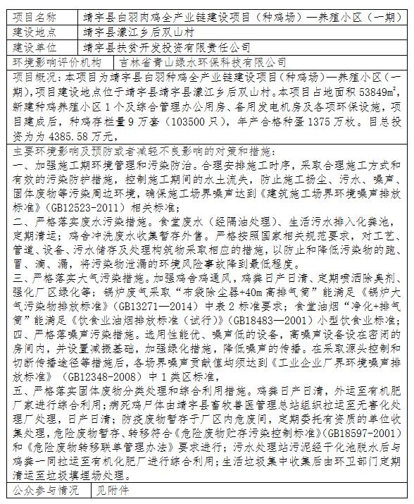 根据建设项目环境影响评价审批程序的有关规定,经审议,我局拟对靖宇县白羽肉鸡全产业链建设项目(种鸡场)—养殖小区(一期)环境影响报告书做出批复决定。为保证审查工作的严肃性和公正性,现将拟审查的环境影响评价文件基本情况予以公示,公示期为5个工作日。
