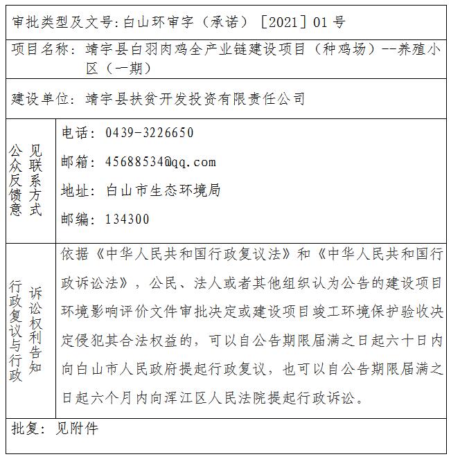 靖宇县白羽肉鸡全产业链建设项目(种鸡场)—养殖小区(一期)环境影响报告书审批决定公开