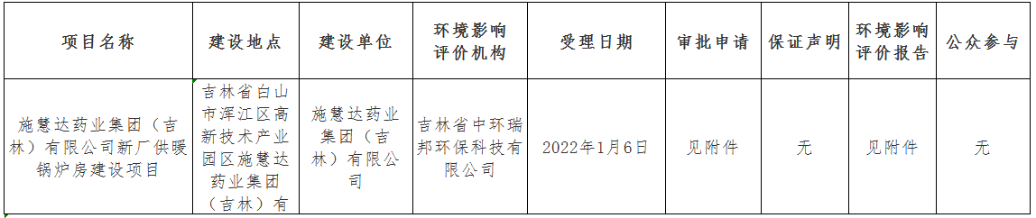 根据建设项目环境影响评价审批程序的有关规定,现将施慧达药业集团(吉林)有限公司新厂供暖锅炉房建设项目环境影响报告表受理情况予以公示,公示期为7个工作日。自公示之日起,建设单位和利害关系人享有要求听证的权利。