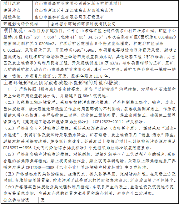 根据建设项目环境影响评价审批程序的有关规定,我局拟对白山市盛泰矿业有限公司采石场五矿扩界项目环境影响报告表进行审查。为保证审查工作的严肃性和公正性,现将拟审查的环境影响评价文件基本情况予以公示,公示期为5个工作日。