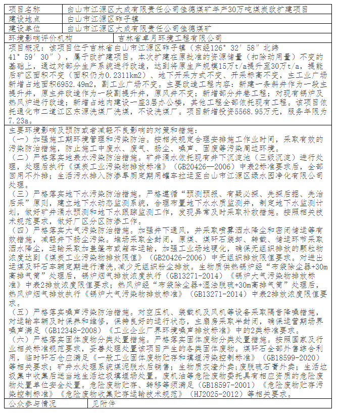 根据建设项目环境影响评价审批程序的有关规定,我局拟对白山市江源区大成有限责任公司佳德煤矿年产30万吨煤炭改扩建项目环境影响报告书进行审查。为保证审查工作的严肃性和公正性,现将拟审查的环境影响评价文件基本情况予以公示,公示期为5个工作日。