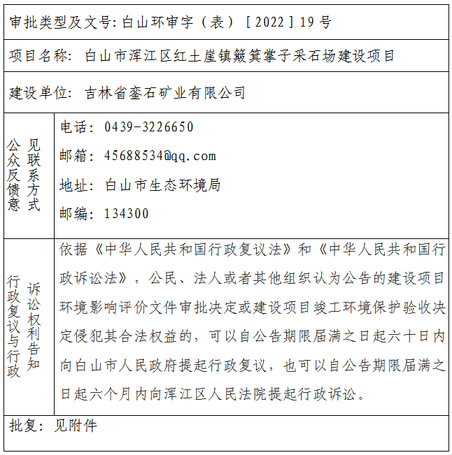 白山市浑江区红土崖镇簸箕掌子采石场建设项目环境影响报告表审批决定公开