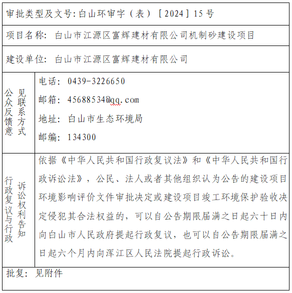 白山市江源区富辉建材有限公司机制砂建设项目环境影响报告表审批决定公开