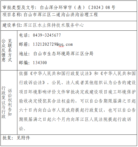 白山市浑江区二道沟山洪沟治理工程环境影响报告表审批决定公开