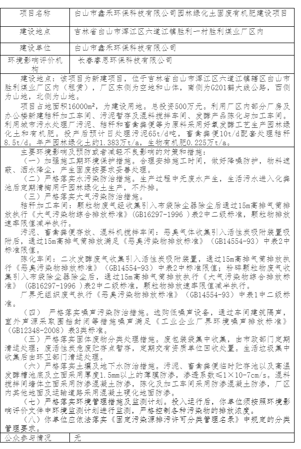 根据建设项目环境影响评价审批程序的有关规定,我局拟对白山市鑫禾环保科技有限公司园林绿化土固废有机肥建设项目环境影响报告表进行审查。为保证审查工作的严肃性和公正性,现将拟审查的环境影响评价文件基本情况予以公示,公示期为5个工作日。