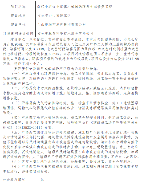 根据建设项目环境影响评价审批程序的有关规定,我局拟对浑江中游红土崖镇小流域治理及生态修复工程对环境影响报告表进行审查。为保证审查工作的严肃性和公正性,现将拟审查的环境影响评价文件基本情况予以公示,公示期为5个工作日。