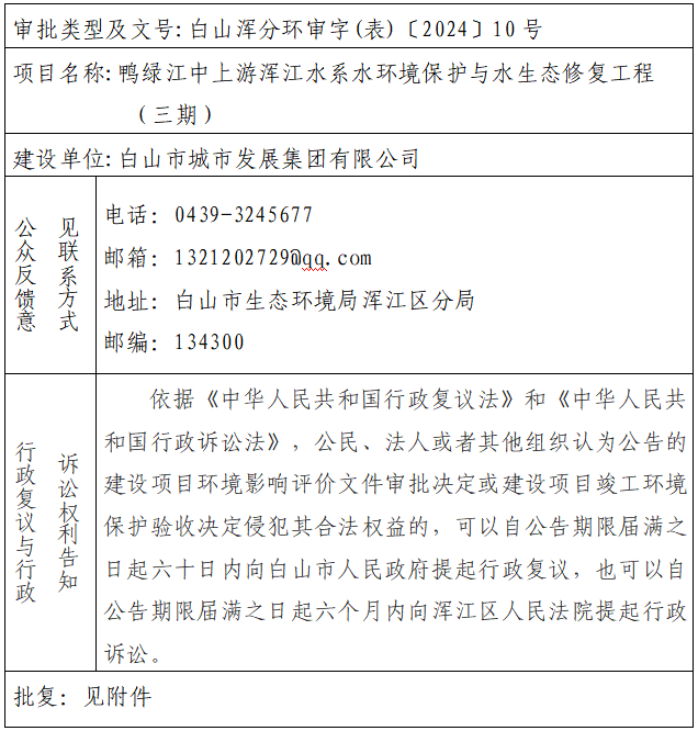 鸭绿江中上游浑江水系水环境保护与水生态修复工程(三期)环境影响报告表审批决定公开