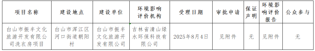 根据建设项目环境影响评价审批程序的有关规定,现将白山市振丰文化旅游开发有限公司洗衣房项目环境影响报告表受理情况予以公示,公示期为7个工作日。自公示之日起,建设单位和利害关系人享有要求听证的权利。