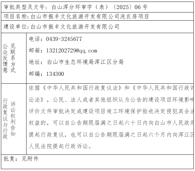 白山市振丰文化旅游开发有限公司洗衣房项目环境影响报告表审批决定公开
