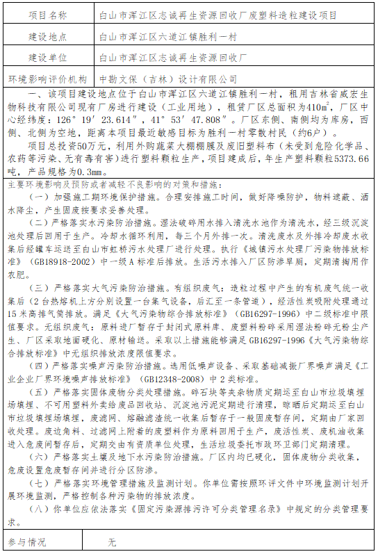 根据建设项目环境影响评价审批程序的有关规定,我局拟对白山市浑江区志诚再生资源回收厂废塑料造粒建设项目环境影响报告表进行审查。为保证审查工作的严肃性和公正性,现将拟审查的环境影响评价文件基本情况予以公示,公示期为5个工作日。