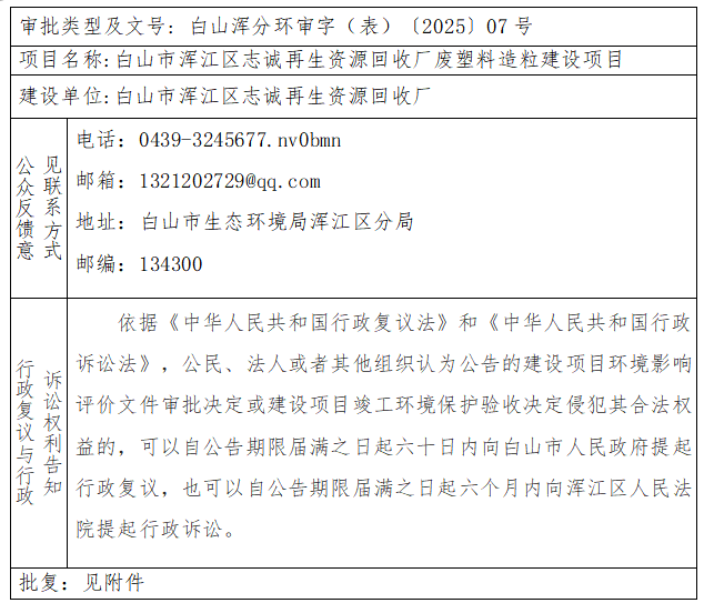 白山市浑江区志诚再生资源回收厂废塑料造粒建设项目环境影响报告表审批决定公开