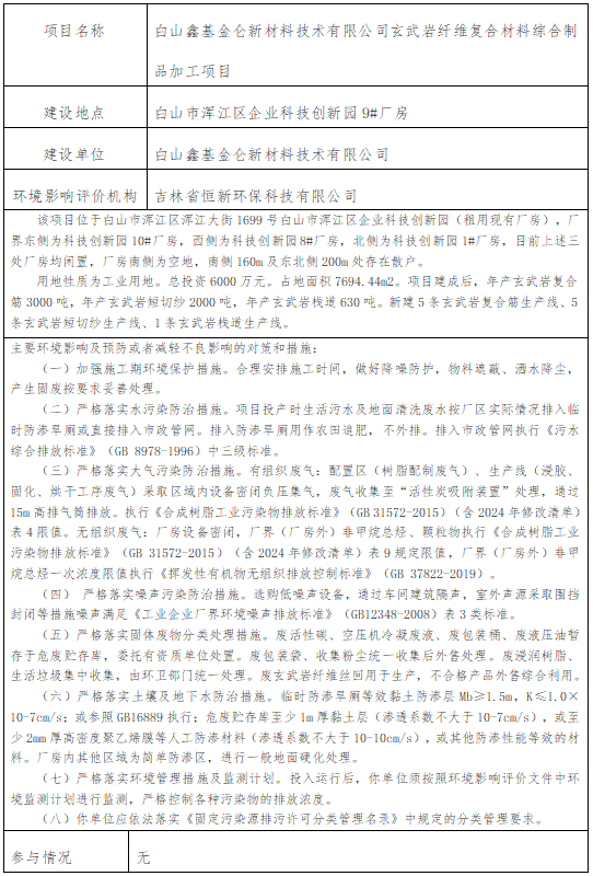 根据建设项目环境影响评价审批程序的有关规定,我局拟对白山鑫基金仑新材料技术有限公司玄武岩纤维复合材料综合制品加工项目固废园林绿化土建设项目环境影响报告表进行审查。为保证审查工作的严肃性和公正性,现将拟审查的环境影响评价文件基本情况予以公示,公示期为5个工作日。