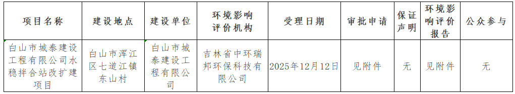 根据建设项目环境影响评价审批程序的有关规定,现将白山市城泰建设工程有限公司水稳拌合站改扩建项目环境影响报告表受理情况予以公示,公示期为7个工作日。自公示之日起,建设单位和利害关系人享有要求听证的权利。