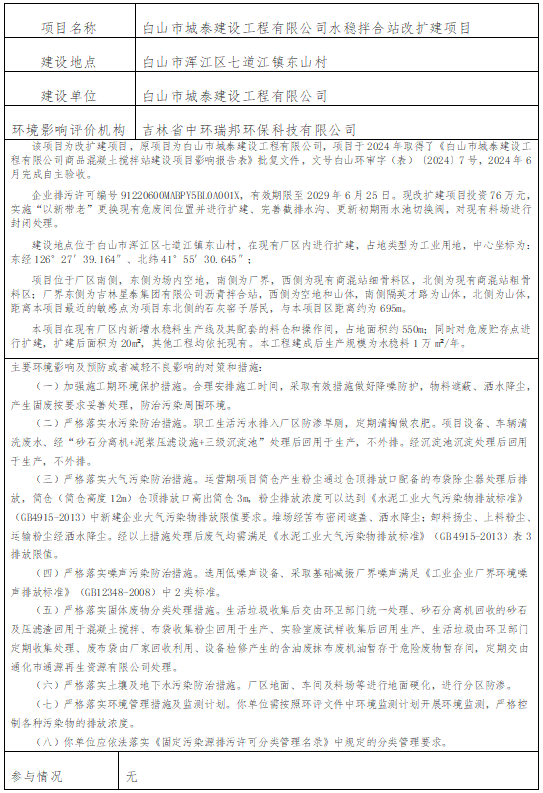 根据建设项目环境影响评价审批程序的有关规定,我局拟对白山市城泰建设工程有限公司水稳拌合站改扩建项目环境影响报告表进行审查。为保证审查工作的严肃性和公正性,现将拟审查的环境影响评价文件基本情况予以公示,公示期为5个工作日。
