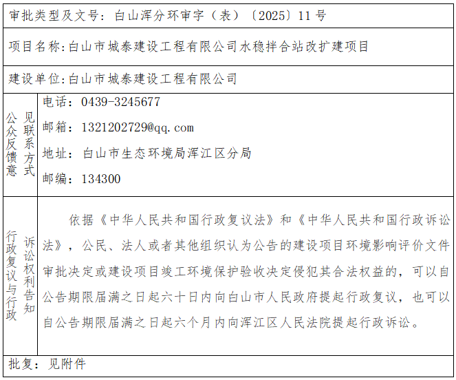 白山市城泰建设工程有限公司水稳拌合站改扩建项目环境影响报告表审批决定公开