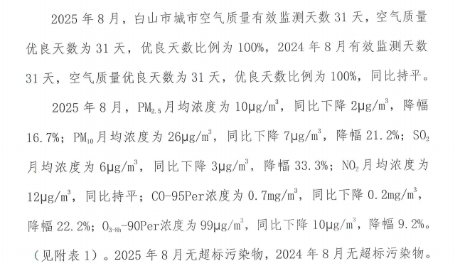 白山市城市空气月报2025年第八期