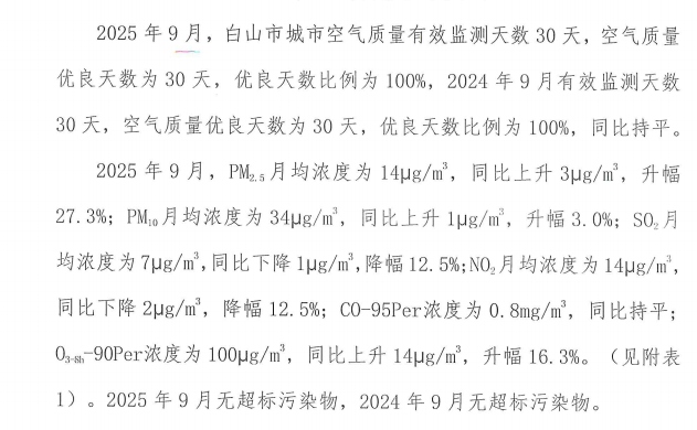 白山市城市空气月报2025年第九期