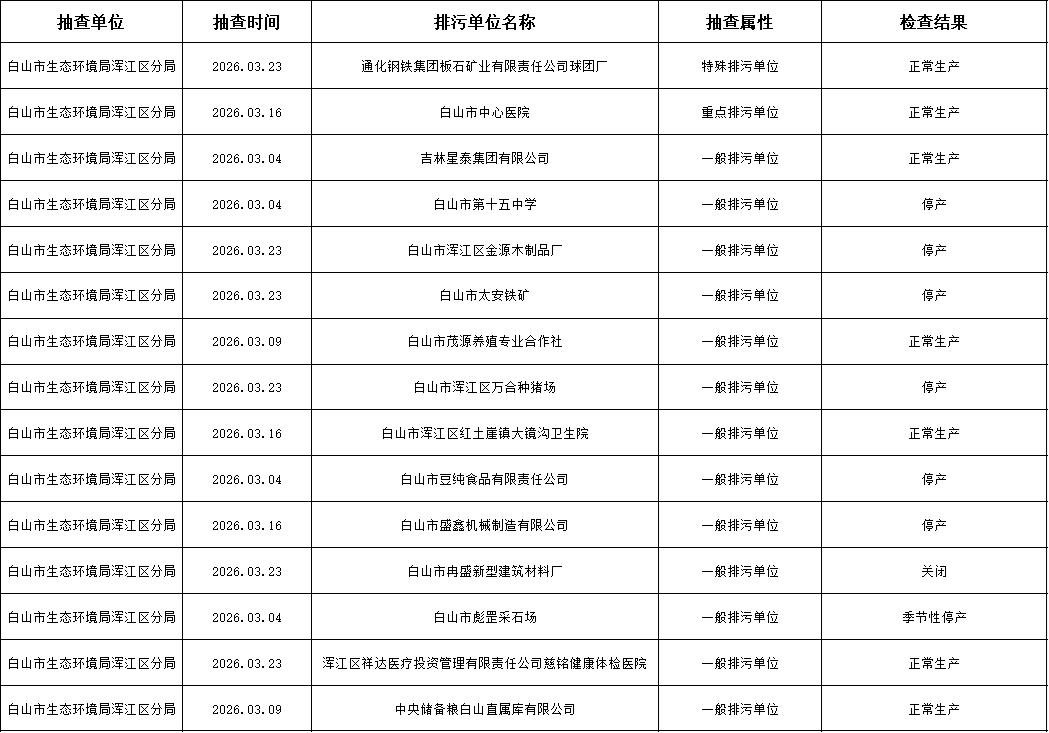 白山市生态环境局浑江区分局2026年1季度随机抽查情况公示