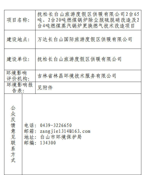 抚松长白山旅游度假区供暖有限公司2台65吨、2台20吨燃煤锅炉除尘脱硫脱硝改造及2台4吨燃煤蒸汽锅炉更换燃气技术改造项目