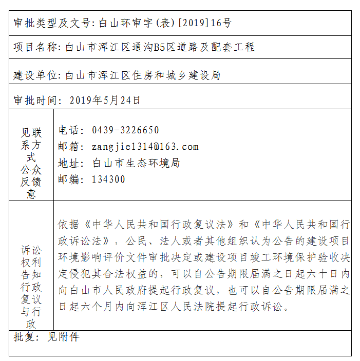 白山市浑江区通沟B5区道路及配套工程环境影响报告表批复公告