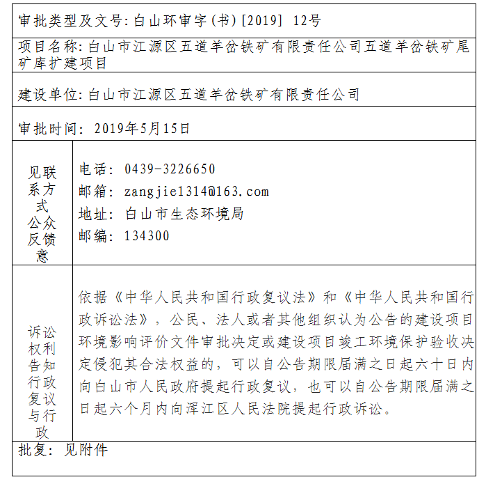 白山市江源区五道羊岔铁矿有限责任公司五道羊岔铁矿尾矿库扩建项目环境影响报告书批复公告
