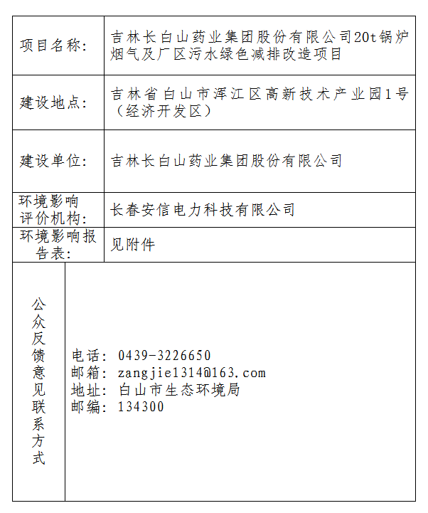吉林长白山药业集团股份有限公司20t锅炉烟气及厂区污水绿色减排改造项目受理情况公开