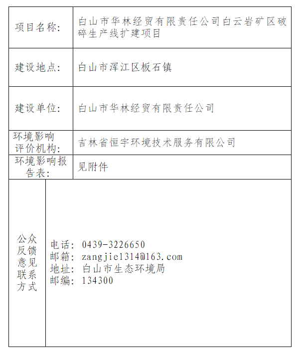 白山市华林经贸有限责任公司白云岩矿区破碎生产线扩建项目受理情况公开