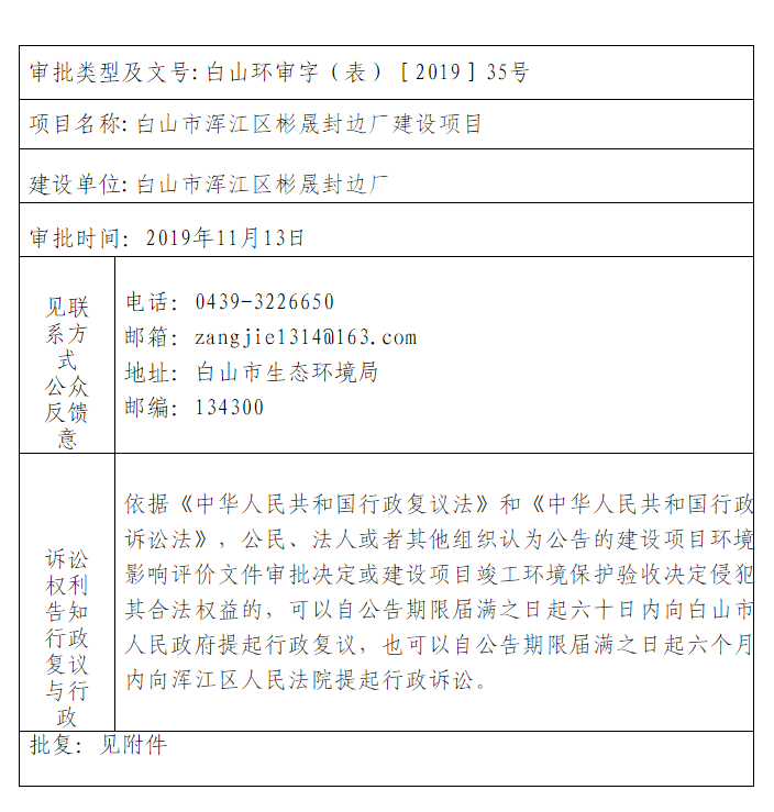白山市浑江区彬晟封边厂建设项目环境影响报告表批复公告