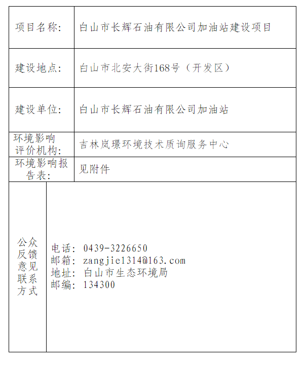 白山市长辉石油有限公司加油站建设项目受理情况公开