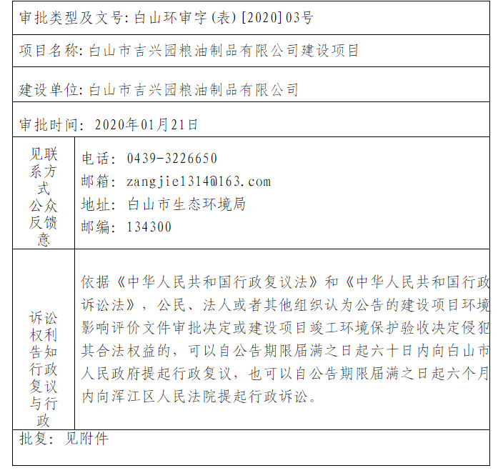 白山市吉兴园粮油制品有限公司建设项目环境影响报告表批复公告