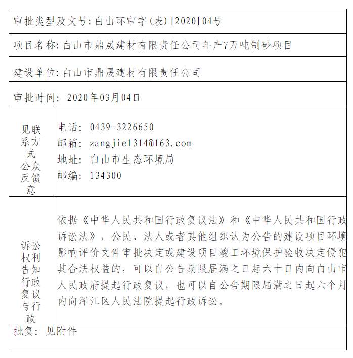 白山市鼎晟建材有限责任公司年产7万吨制砂项目环境影响报告表批复公告
