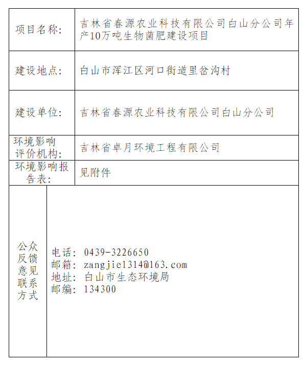 吉林省春源农业科技有限公司白山分公司年产10万吨生物菌肥建设项目受理情况公开