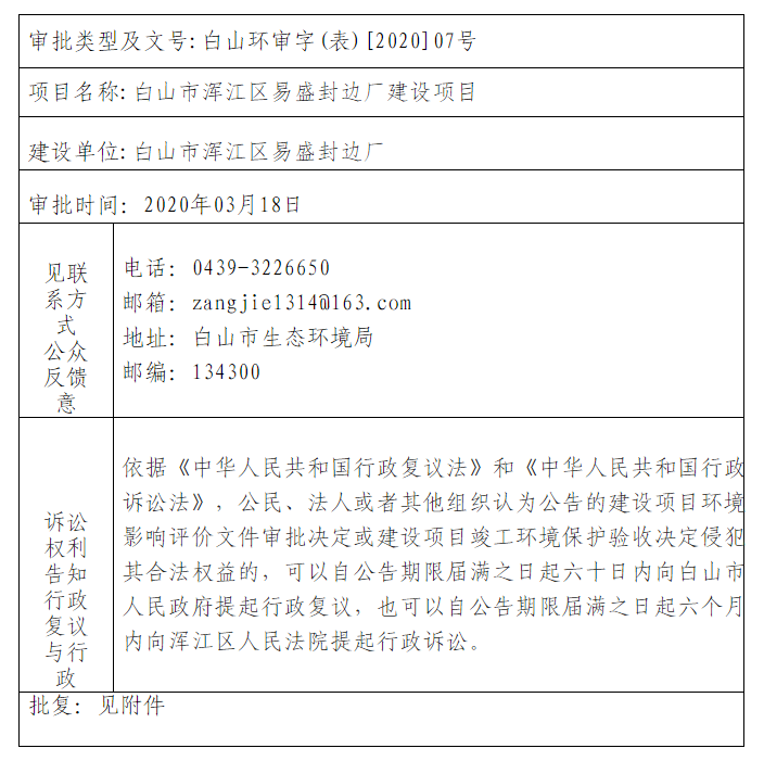 白山市浑江区易盛封边厂建设项目环境影响报告表批复公告
