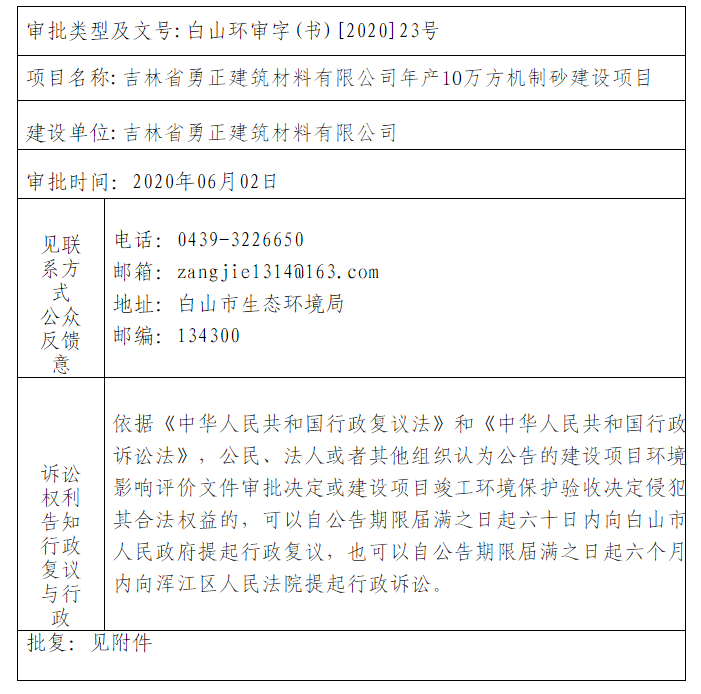 吉林省勇正建筑材料有限公司年产10万方机制砂建设项目环境影响报告表批复公告