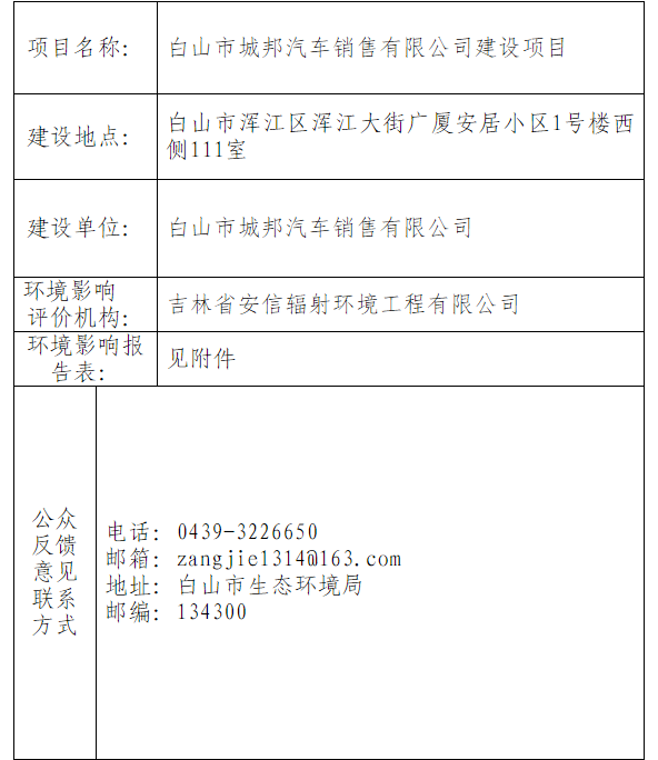 白山市城邦汽车销售有限公司建设项目受理情况公开