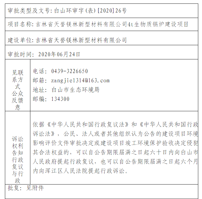 吉林省天誉镁林新型材料有限公司4t生物质锅炉建设项目环境影响报告表批复公告