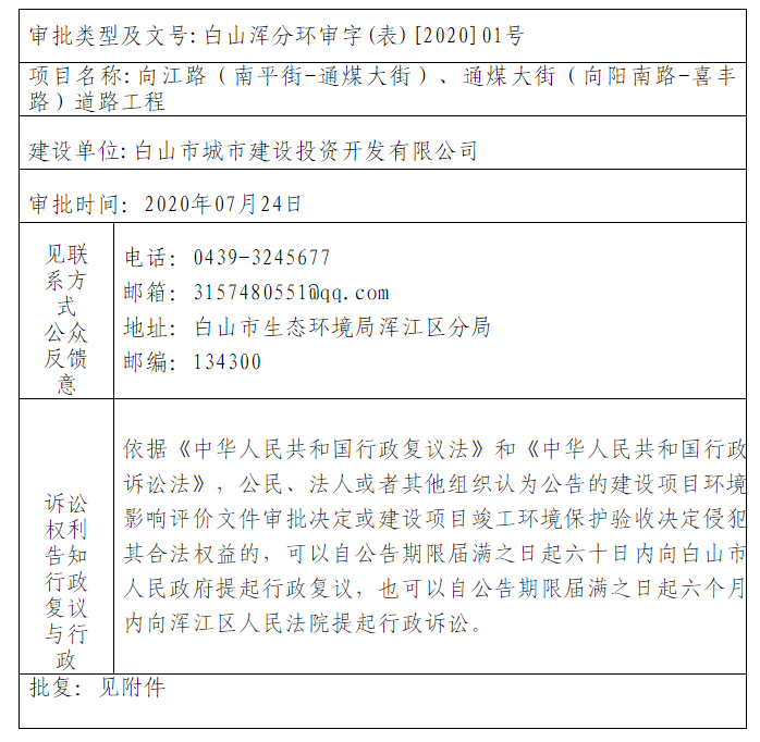 向江路(南平街-通煤大街)、通煤大街(向阳南路-喜丰路)道路工程环境影响报告表批复公告